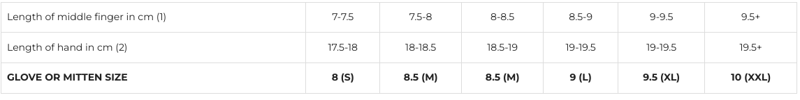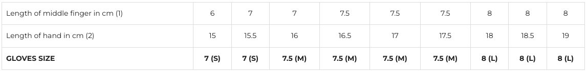 Longueur du majeur en cm (1) | 7-7.5 | 7.5-8 | 8-8.5 | 8.5-9 | 9-9.5 | 9.5+ |