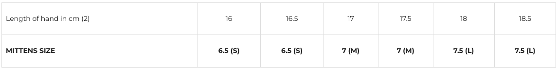 Longueur de la main en cm (2) | 17.5-18 | 18-18.5 | 18.5-19 | 19-19.5 | 19-19.5 | 19.5+ |