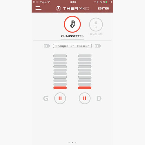 By clicking on the "Edit" button, you can modify the profile of your product or delete it. You can manually turn off your warmers or do so using the application by pressing and holding the "pause" button for 3 seconds. When the screen turns completely grey, your warmers are off. Just turn them on to get the screen working again. You can register a new pair of warmers. Simply click on the "+" button, connect your warmers and repeat the above mentioned steps.