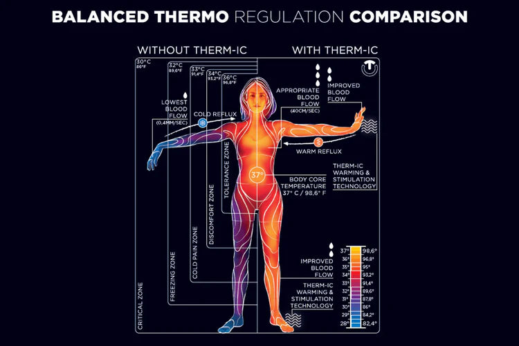 This is thanks to natural mechanisms by which he acclimatises and self-regulates his environment. This is how his body climate works. Regardless of the environment, humans seek to maintain their bodies at a constant temperature. Man is therefore a "warm-blooded" being, known as a homeotherm: whatever the external conditions, he regulates his internal temperature around an average target value of 37°C. Why do we do this? Because it is at 37°C that our metabolic and muscular functioning is optimal. In other words, it is at 37°C that our cells and muscles are most efficient. To be more precise, this body temperature oscillates between 36.1°C, in the middle of the night, at the moment when metabolic functioning is at its most calm, and 37.8°C, at the end of the afternoon, at the time of peak activity. Although humans are homeothermic, some species such as lizards are said to be poikilothermic. This means that their internal temperature is equivalent to that of the ambient air. This is why it is important to keep your body and extremities at a regular temperature, whatever the temperature and conditions. Therm-ic products will help protect you from these temperature changes.