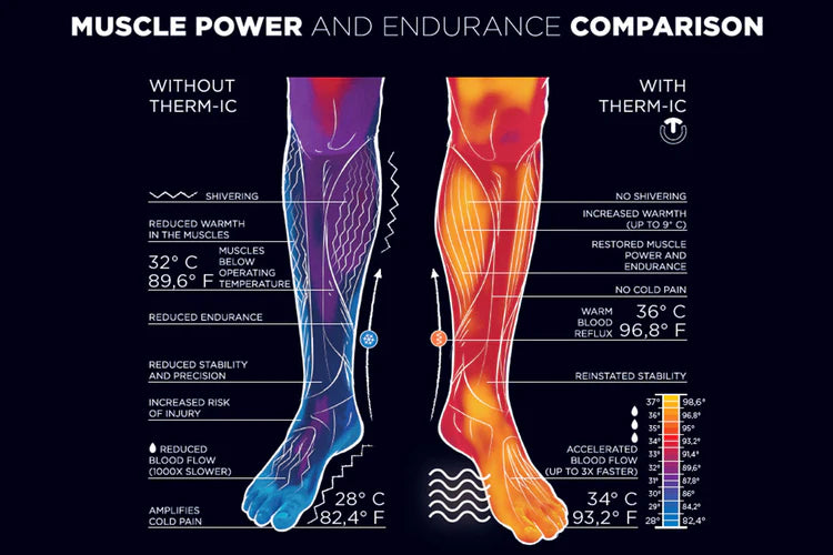 Up to 75% of our muscle power falls victim to the cold. When cold pain is reported to the brain, over 90% of the available energy is sent to warm the affected muscles. This results in reduced muscle power and endurance as well as shivering.